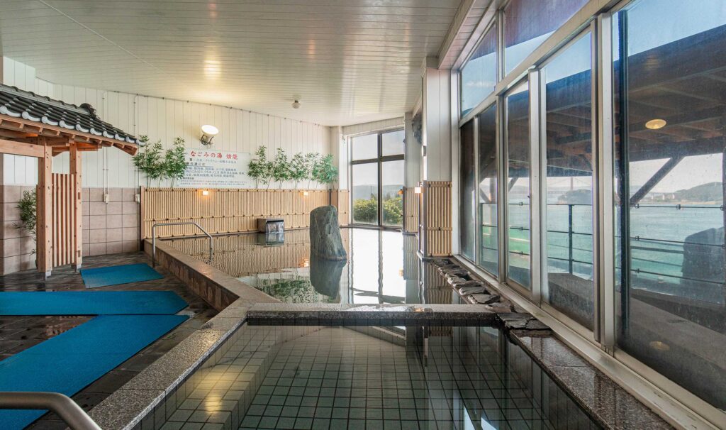 露天風呂からは、平戸瀬戸の海と赤色が特徴的な平戸大橋、そして対岸にある平戸城を一望でき、昼はキラキラと光る海、夜はライトアップされた橋が幻想的で、時間を忘れて浸かっていたくなるほどの絶景です。