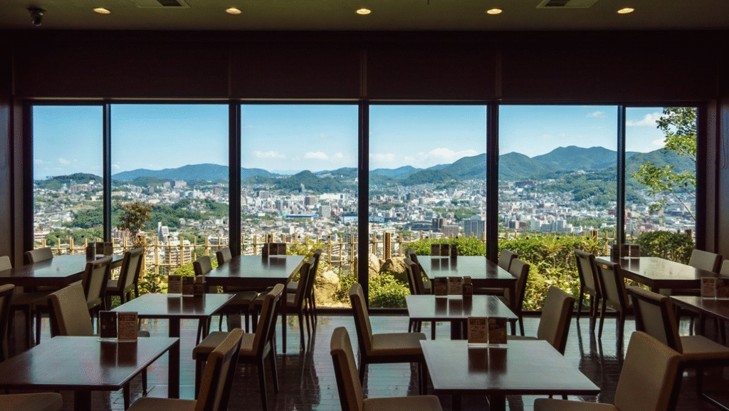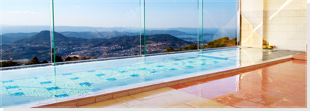 佐世保市街を見渡す高台に建つ「弓張(ゆみはり)の丘ホテル」では、宿泊者だけでなく日帰り温泉でも利用でき、開放感あふれる眺望と温泉を同時に楽しめます。