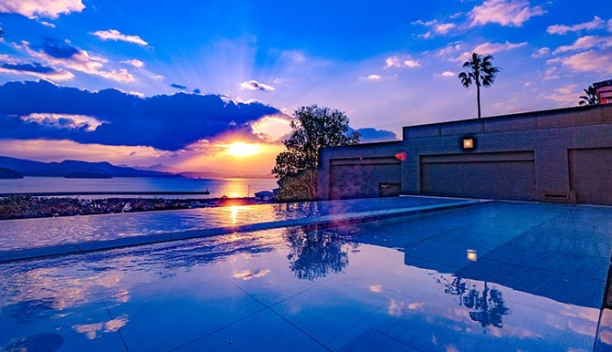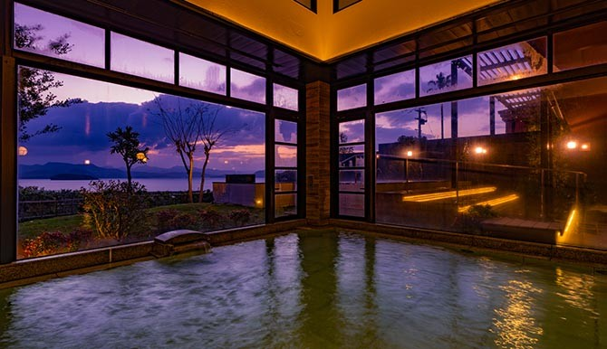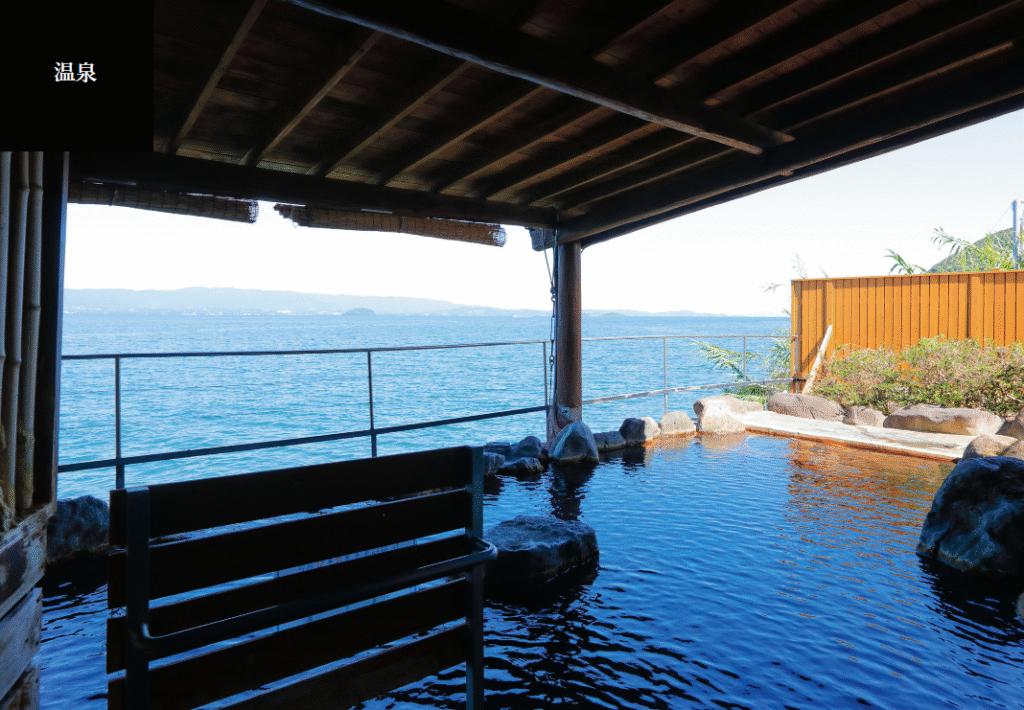 「長崎温泉 喜道庵(きどうあん)」この施設の最大の魅力は、なんといっても露天風呂から望む大村湾の景色。すぐ目の前に広がる海は迫力があり、開放感たっぷり。